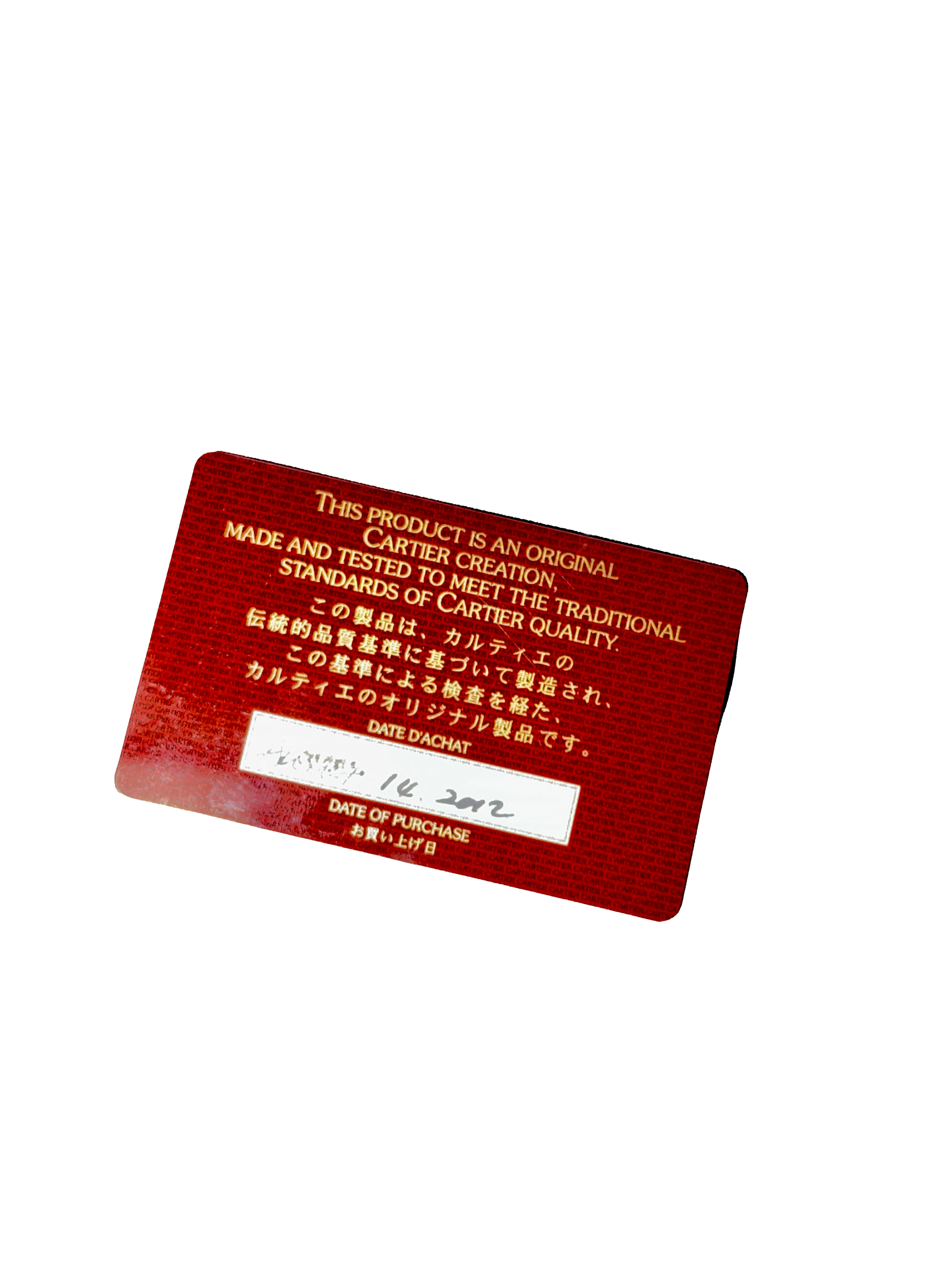 Ce modèle compact est confectionné en cuir de veau lisse, dans un ton bordeaux profond typique des collections vintage de la maison. L’extérieur est orné du monogramme emblématique embossé, et protégé par quatre angles en métal doré, à la fois décoratifs et fonctionnels. L’intérieur, également en cuir, comprend deux emplacements pour cartes et un compartiment principal pour billets ou documents. Il est doublé de cuir lisse avec marquage doré “Cartier Paris”. Une pochette transparente permet d’y glisser une pièce d’identité ou un badge. Le modèle est accompagné de sa carte d’authenticité rigide numérotée VL054681, confirmant son origine.