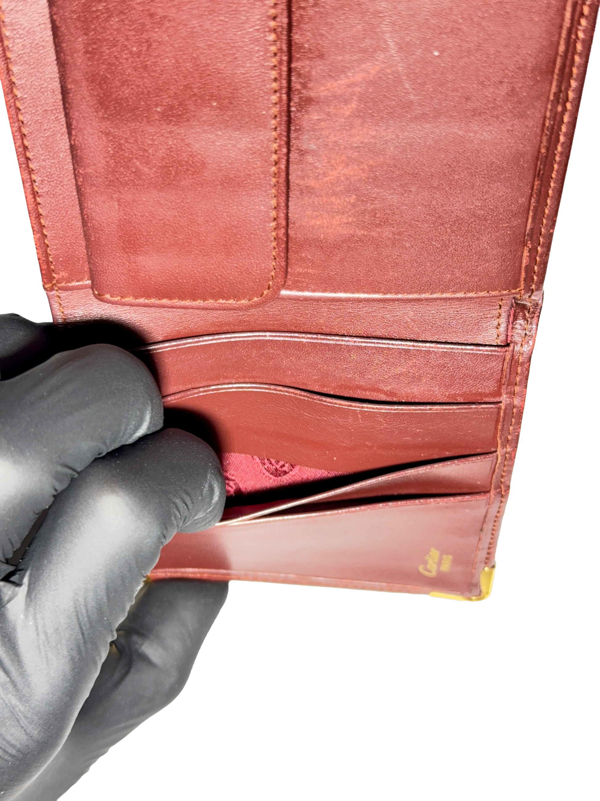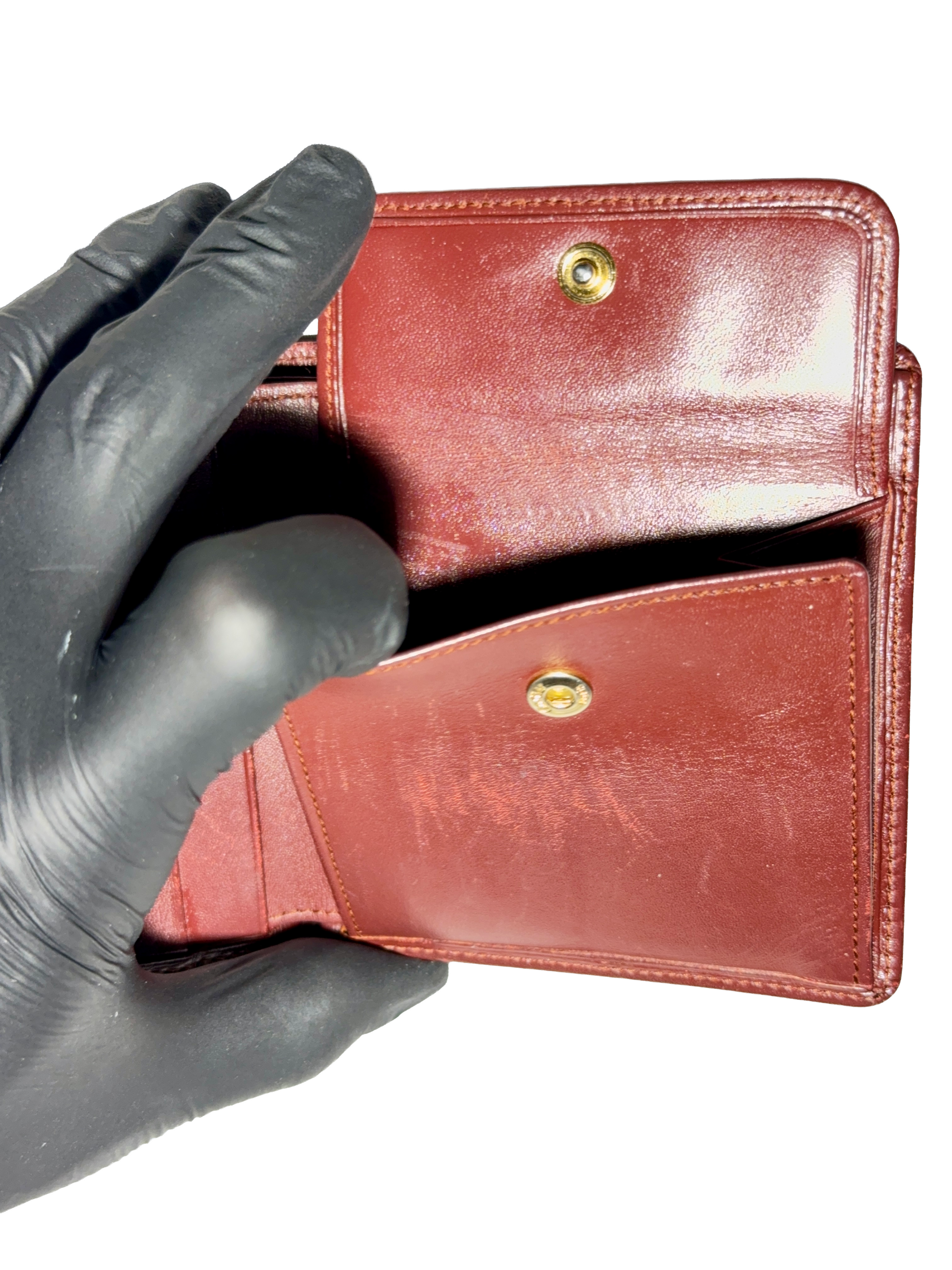 Portefeuille en cuir bordeaux signé Must de Cartier, avec finitions dorées et logo embossé.